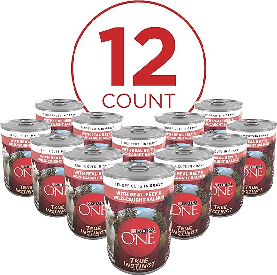 Natural dog food formula with added vitamins for dogs plus minerals and nutrients is made with real beef and wild-caught salmon No artificial flavors or preservatives and no poultry by-products in this Purina high protein canned dog food 100 percent nutrition for adult dogs. 0 percent fillers. Every ingredient in this wet dog food gravy recipe has a purpose Purina ONE is veterinarian recommended, and the savory gravy adds an appealing finishing touch High protein in this dog wet food helps support strong muscles, and antioxidants help support the immune system