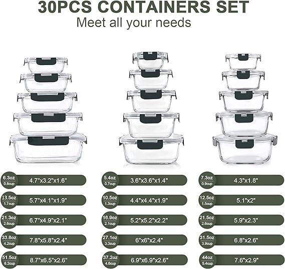 FOOD CONTAINER SET 30 PIECES: 15 Containers with 15 lids with multiple sizes and shapes to fulfill your storage requirement. Package includes: 1 (50.1 oz), 1 (33.8 oz) 1 (21.3oz ) 1 (13.5oz )1 (6.3 oz) 1 (37.2 oz) 1 (27.1 oz) 1 (16.9 oz) 1 (10.5 oz) 1 (5.4 oz) 1 (44 oz), 1 (31.5 oz) 1 (21.5oz ) 1 (12.5oz )1 (7.3 oz) container with lids. Easily stack-able for storage in refrigerator. HIGH QUALITY BOROSILICATE GLASS: Our glass storage containers are made of high quality borosilicate glass, which is stronger than cheaper glass food storage containers. Food can be directly stored to the containers after cooking. Great for gym, leftovers, picnic, portion control, office lunches, travel, and more, Stay healthy and save time by cooking and freezing your meals for later. FOOD GRADE & BPA FREE: Made of non-toxic and BPA free premium material.Easy to use and easy to take care of, as it’ can be used in the microwave, freezer, dishwasher, and oven. Take off the lids before placing in dishwasher, oven and microwave for better maintenance. Easy to clean without absorbing stains or smells, you can use them over and over again. AIRTIGHT SNAP LOCKING LIDS: KOMUEE Glass food storage containers use snap lock lids that comes with silicone seals to ensure your meal prep food will last much longer than normal plastic food storage containers, prevent the food from spilling. These lids are easy to open, shut and will stop leaking. These lids will not break or slowly stop working. CUSTOMER SERVICE: If you have any questions or issues regarding the KOMUEE glass containers set please do not hesitate to send the seller a message through Amazon we will respond within 24 hours.
