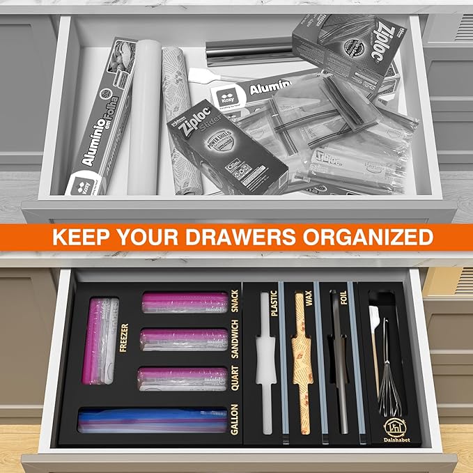 TRANSFORM CHAOS into ORDER: Tired of struggling with cluttered drawers that jam every time you try to open them? Revolutionize your kitchen organization with the DALSHABET 9-in-1 Bamboo Kitchen Organizer, this versatile organizer is designed to enhance your kitchen storage experience. MAXIMIZE YOUR SPACE: Take back control of your kitchen space with this innovative organizer. It's the ultimate clutter-busting solution, neatly storing Storage bags, foil, plastic wrap, wax paper, and more. Say goodbye to messy countertops and cluttered drawers. All-in-One Baggie & Wrap Organizer: This versatile set includes a 3-in-1 foil and wrap dispenser with a cutter, designed for aluminum foil, plastic wrap, and wax paper. It also features a food storage bag organizer that accommodates sandwich bags, quart bags, snack bags, and gallon bags. Plus, a drawer organizer storage box for your clips or small items. CRAFTED from 100% NATURAL BAMBOO: Our plastic wrap dispenser is constructed from premium bamboo, known for its durability and eco-friendliness because the bamboo is renewable, The superb craftsmanship ensures it will stand the test of time while adding a warm, natural touch to your kitchen. DETACHABLE & CONNECTABLE DESIGN: This storage bag organizer is designed with flexibility in mind. It can be connected to hang on the wall or detached for placement in your drawer or on your countertop, depending on your space requirements. Organize your wrap rolls and food storage bags conveniently and efficiently. The Perfect Gift: Looking for a thoughtful gift idea? Our Aluminum Foil Organization and Storage Set is a fantastic choice for various occasions, including Mother's Day, housewarming parties, birthdays, and Christmas. It's a gift that will be appreciated by anyone who loves organization and values a well-kept kitchen.