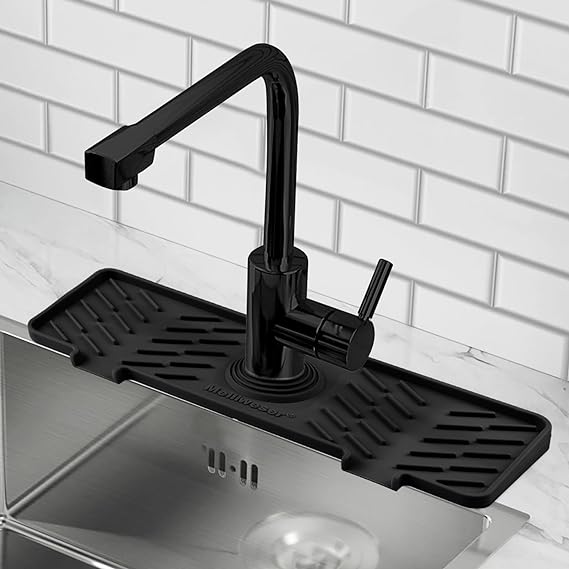 Meiliweser Silicone Faucet Splash Guard Gen 3-10° Large Slope & Adaptable Hole Faucet Handle Drip Catcher Tray - 14” x 5.5” Kitchen Sink Accessories for Kitchen, Bathroom(Black)