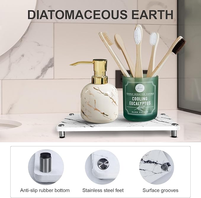 INSTANT DRYING: Diatomaceous earth sink caddy can hold up to twice its weight of water and fully absorb it within a few seconds. Keep the bathroom and kitchen countertops dry and waterless. HIGH QUALITY: Stone sink caddy is made of environmentally friendly and durable diatomaceous earth. The feet of the sink caddy are made of stainless steel and equipped with a non slip rubber bottom, which can withstand the worst wet conditions and reduce hard water stains on the countertop. MODERN DESIGN AND PRACTICAL: The design of the marble sink caddy is simple and beautiful and perfectly integrated into the bathroom or kitchen. The raised base design can promote rapid drying, reduce the accumulation of stain, and keep the counter dry. MULTI FUNCTION: Instant drying stone is used as soap and brush in kitchen, lotion in bathroom, toiletries and toothbrush cup. This sink tray provides a clean and orderly space for your kitchen, bathroom, or room, making it your best home essentials for new home! EASY TO ASSEMBLE: The sink tray size is approximately 11 x 4.7 x 0.98 inches, and our sink tray can hold up to 30 pounds per layer. Your sink tray can be easily assembled without any tools.